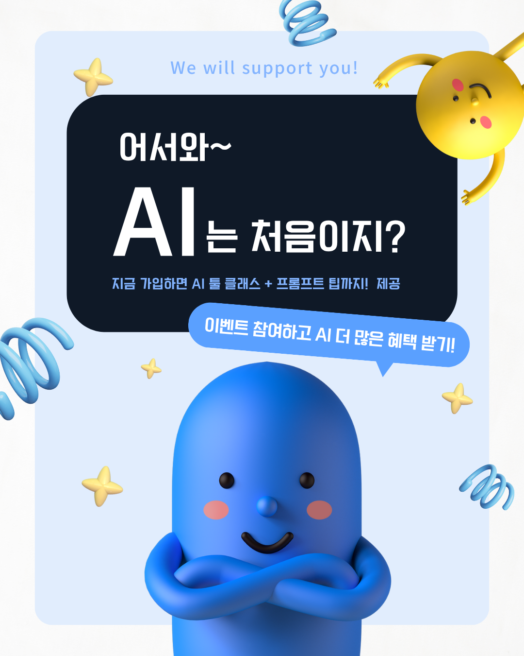 (2)“AI랑 노는 사람, 여기 다 모였어요 🎉”(지금 가입하면 AI 툴 클래스 + 프롬프트 팁까지! / 이벤트 참여하고 AI 더 많은 혜택 받기! ) - 톤앤매너 - 밝고, 유쾌함. 귀여움.