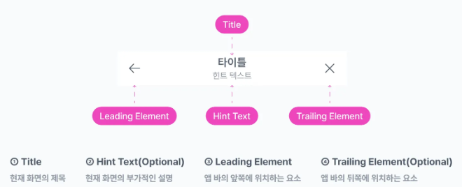 = 명칭은 여러가지 ; 머티리얼 디자인에선 앱 바(App Bar) / iOS에서는 네비게이션 바(Navigation Bar) 등등
