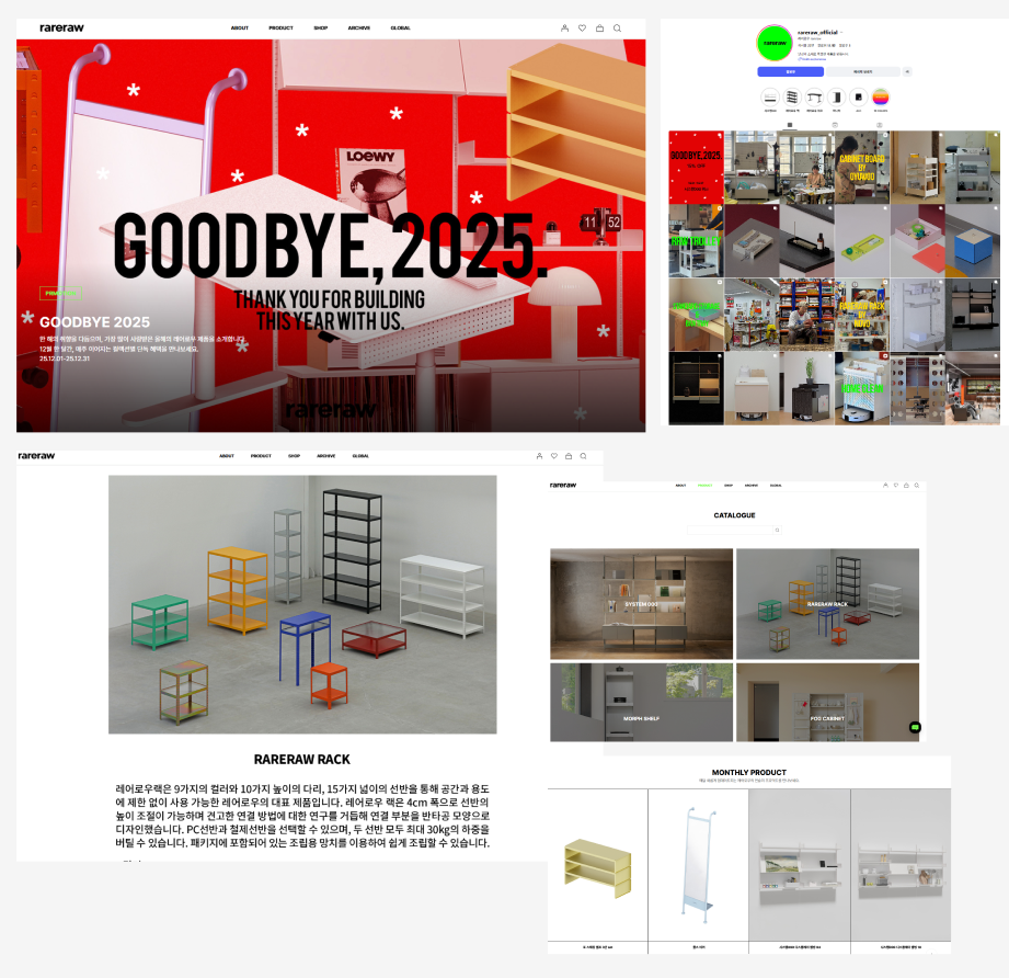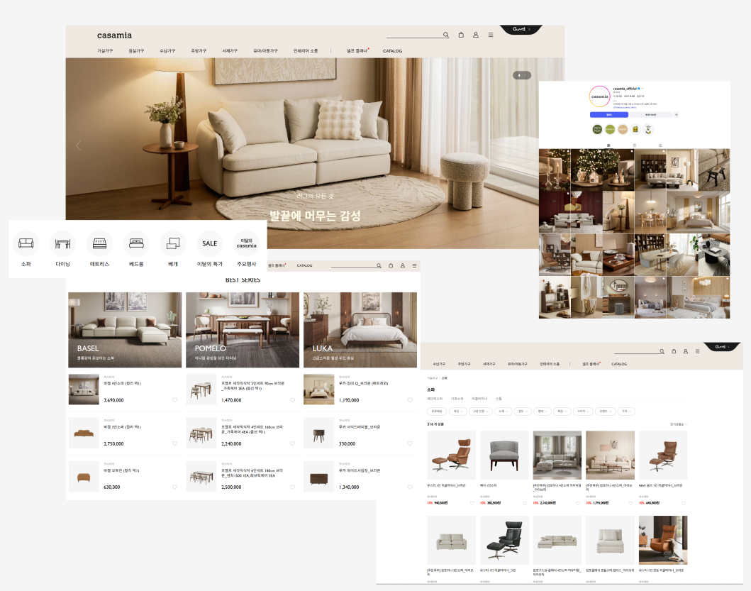 제품보다 공간 속에서의 조화와 질감을 강조하며, 차분한 색감과 정돈된 타일형 구조로 브랜드 분위기를 표현