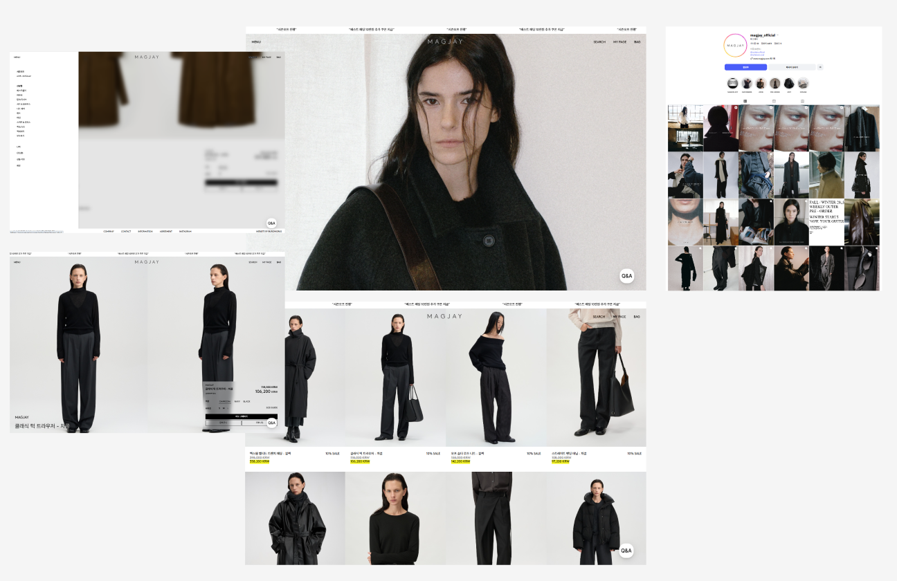 이미지가 브랜드를 정의하기 때문에, 모델 컷과 화보 구성이 핵심 시각 언어로 사용