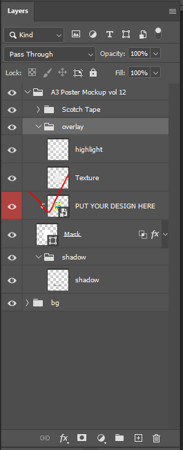 레이어 창을 들어가면 이렇게 여러 항목이 있는데, 잘 읽어보면 '당신의 디자인을 여기에 넣으세요' 란이 있다