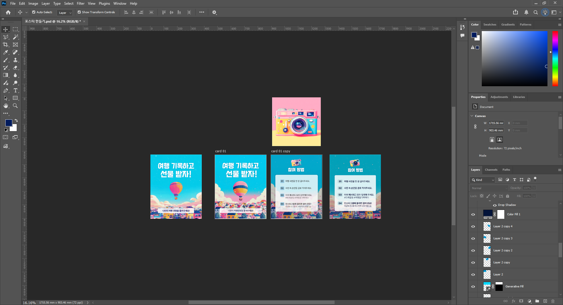: 주어진 자료들을 모두 취합하여, 포토샵 파일 옮겨, 필수과제 1부터 진행하였다. 레이아웃, 컬러감 등등 분석하며 포스터? 같은 카드뉴스 제작하며 포토샵을 심층적으로 학습하는 시간을 가졌다