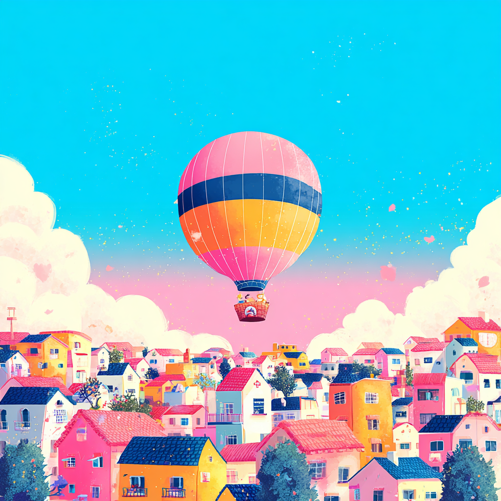 a big hot air balloon in the center of the image, floating over a colorful travel town, dreamy pastel sky, wide blue space above for text, vivid illustration style, travel mood, soft lighting, whimsical and bright