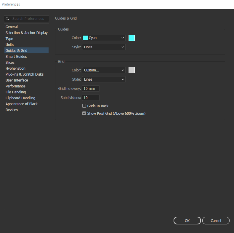 Edit > Preferences > Gides & Grid