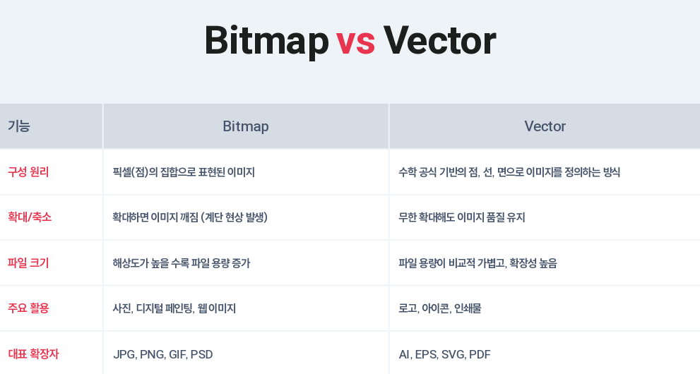 사진 촬영, 인물 보정 > 복잡한 색상과 질감이 필요한 경우 : 비트맵 형식이 적절각각의 픽셀에 다른색이 적용될수있고, 이미지의 풍부한 색 표현 > 사실적 표현 가능