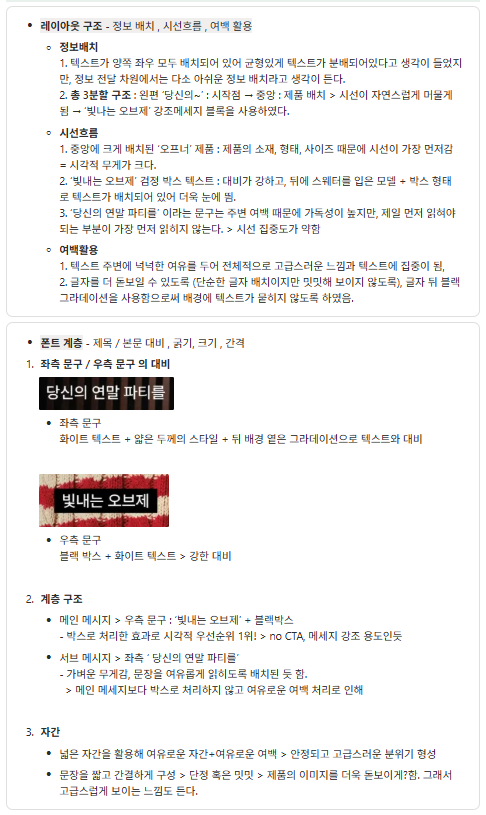 | 폰트 계층 | - 강조 텍스트 블랙 박스로 처리 - 여백 넓게 사용 (자간이 넓음) |