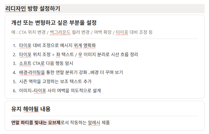 → 이건 리디자인이 아니라 리브랜딩/캠페인 제안에 가까움