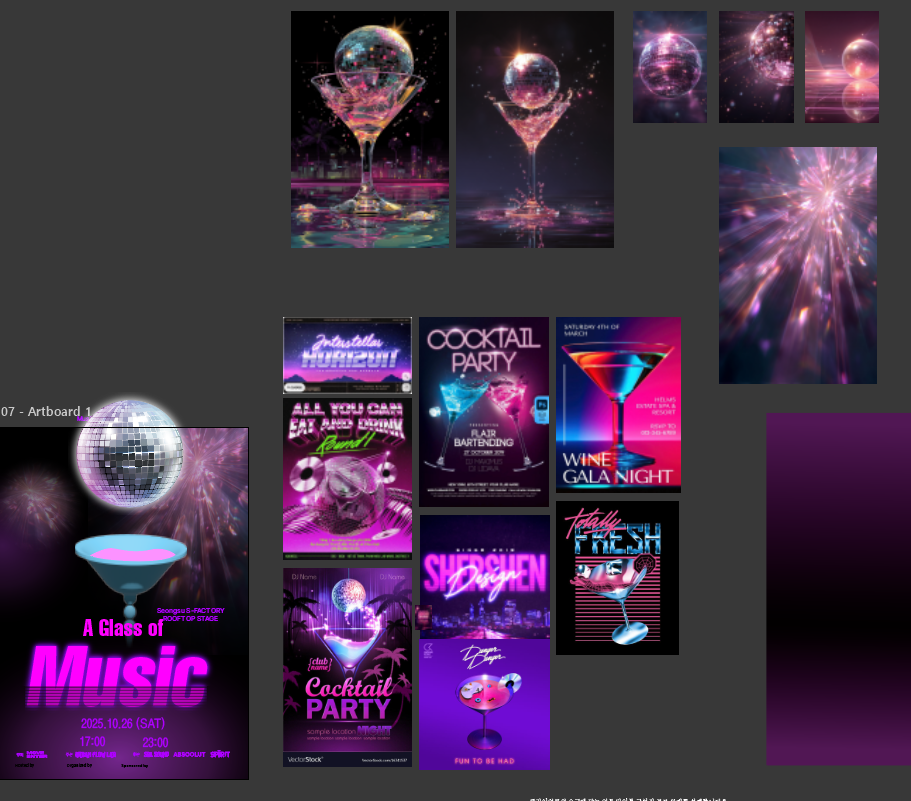클라이언트가 행사 타깃과 시장 방향을 바꾸었습니다. 이전의 감성적인 밤 분위기 대신 화려하고 글로벌한 디스코 파티 콘셉트를 요청했습니다. 즉, 같은 페스티벌이지만 타깃(외국인 관객) 과 감정선(디스코·레트로 무드)이 달라지면서 디자인 언어 전반을 다시 설계해봅니다.