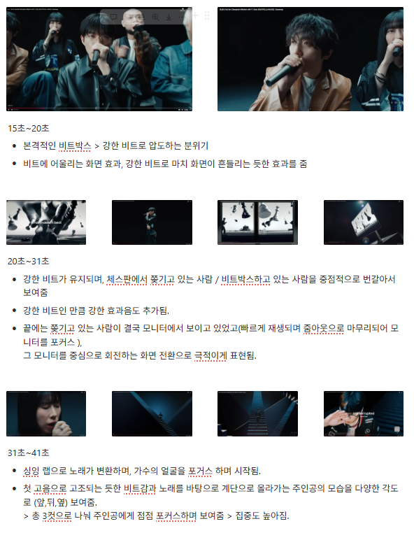 또한 고음이 나오는 싱잉랩 타이밍에, 영상 내용도 하이라이트 및 계단을 오르는 등 상승하는 느낌의 영상이 표현되어 기억에 남았다.