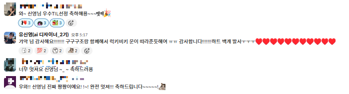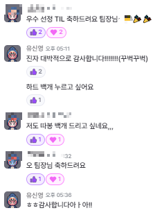 : 나도 모르는 새에 튜터님의 댓글이 있었고,, 그게 우수 TIL이라는 결과물이 나와 너무 기뻤다..