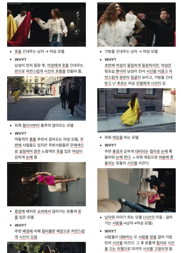 - 카메라가 모델의 움직임을 따라가, 화면 중심이 자연스럽게 모델에게 유지되게 함. (대부분의 장면에서 모델은 화면의 중앙에 배치)