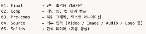 - Ctrl + 1 / 2 / 3 : 패널 간 전환 (Project, Composition, Timeline)