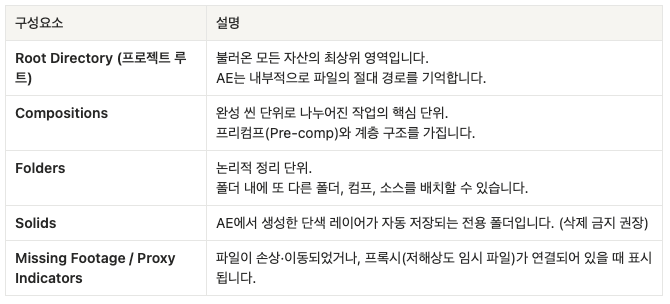 - AE의 기본 인터페이스 구조와 각 패널의 역할 이해